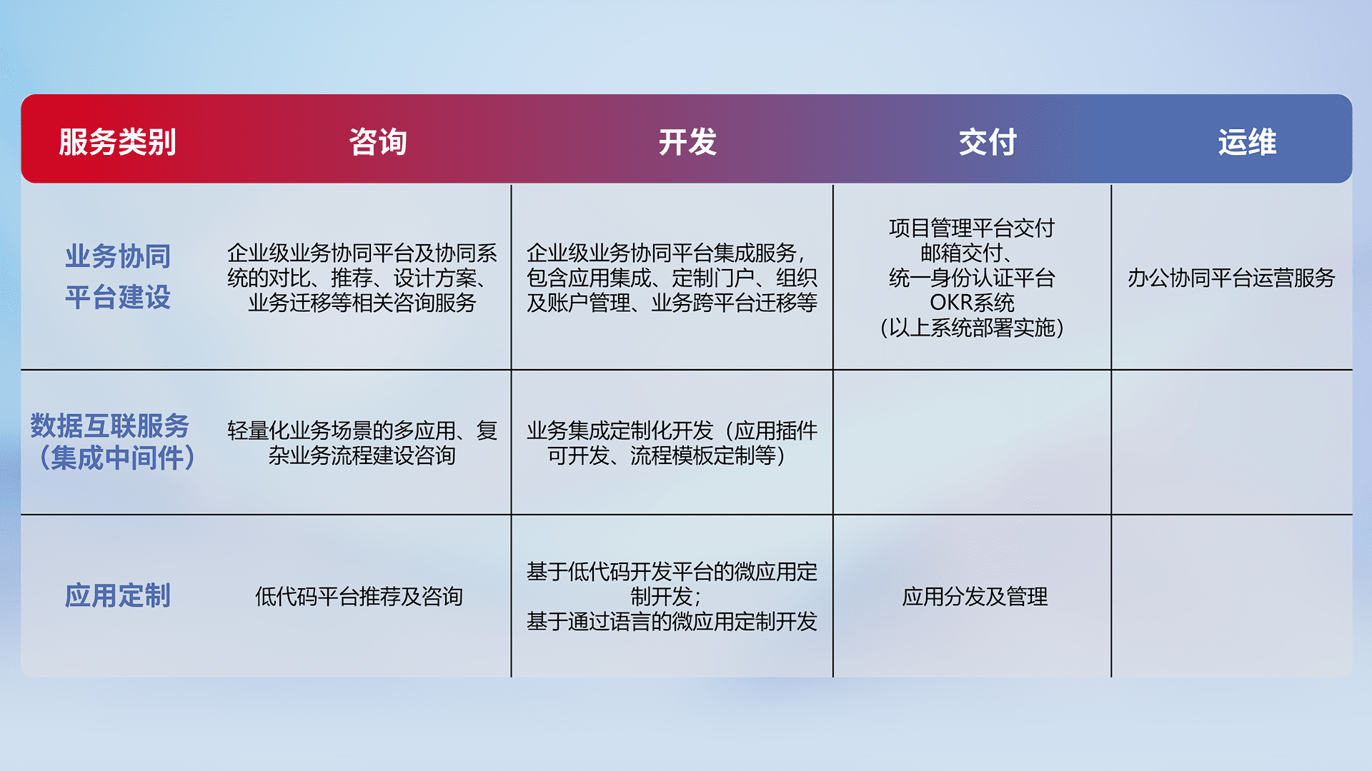 针对钉钉、、、、企微、、IDaas等平台级产品提供产品的规划、、、、方案、、交付、、、、定制化开发等服务,,,实现如统一协同办公、、、智能客户服务、、、混合会议管理、、、智能数据查询、、等业务场景,,,,实现数字化转型。。。。