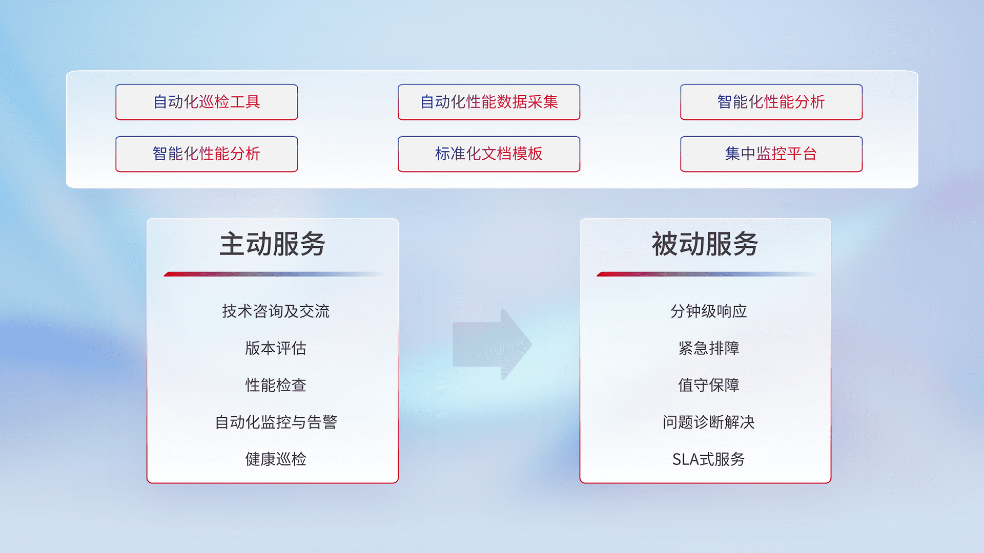 智能化工具和标准化文档,,,,保障服务质量,,提供主动服务(包含技术咨询、、版本评估、、、性能检查、、、、自动化监控与告警、、健康巡检)和被动服务包含(分钟级响应、、、紧急排障、、值守保障、、、、问题诊断解决、、、SLA服务)。。
